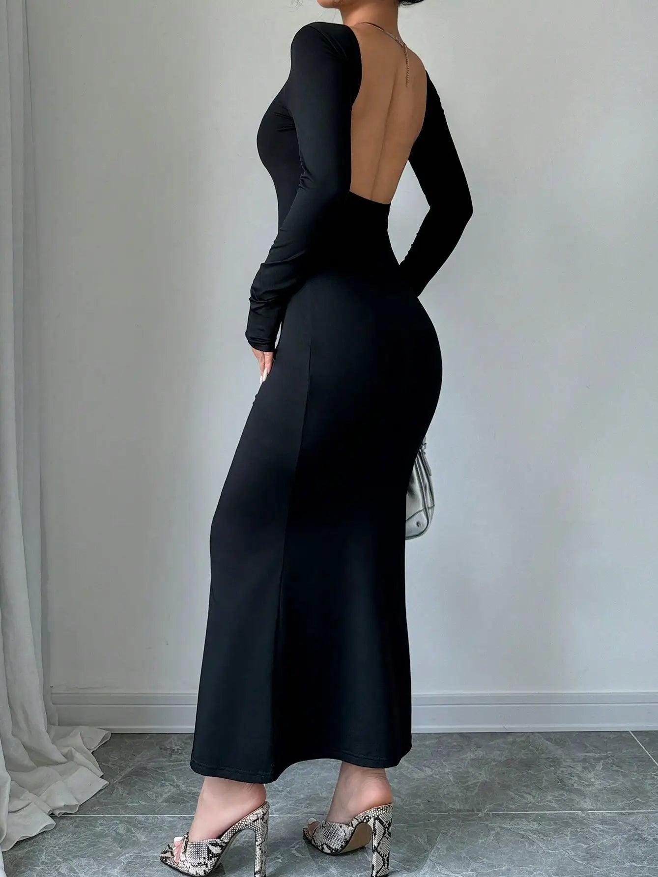 Dare to stand out in this sleek Black High-Waisted Long-Hip Bodycon Dress. Designed with a stunning backless cut and elegant full-length sleeves, this dress sculpts your figure while keeping things sophisticated and bold. The high-waisted silhouette elongates your frame, and the long-hip fit adds a dramatic flair, perfect for upscale evenings or fashionable events.