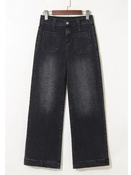 These jeans offer a wide leg cut that provides a comfortable and relaxed fit. The high waist style accentuates the waistline and elongates the legs for a flattering silhouette. The patched pockets front and back are practical and functional. Crafted with durable denim, perfect for everyday wear and can be styled with various tops.