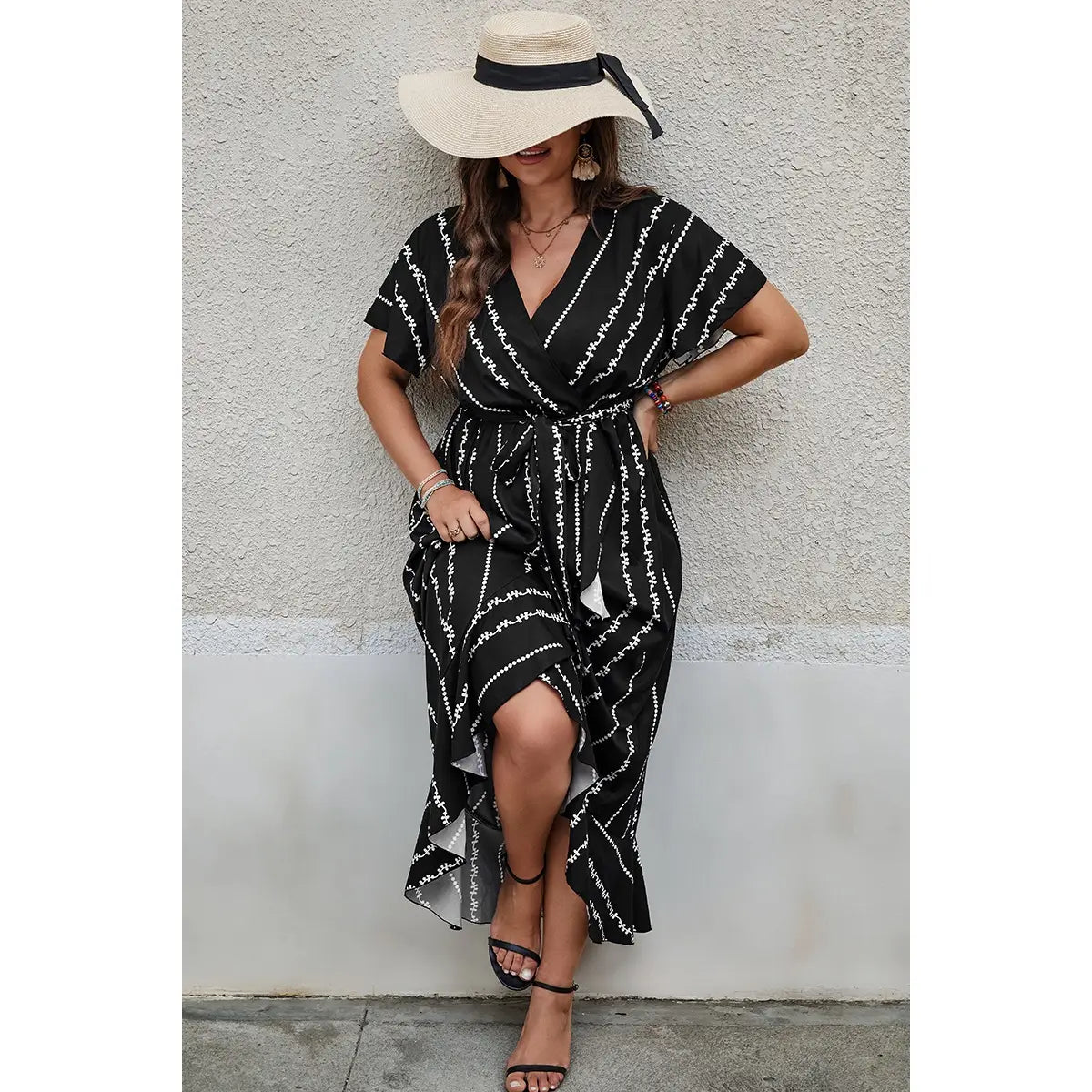 Step out in timeless style with our Black & White Striped Wrap Dress, where classic design meets modern flair. Featuring a flattering V-neckline, short sleeves, and an adjustable waist tie, this dress hugs your curves in all the right places. The asymmetrical hemline adds a chic twist, while the lightweight, flowy fabric ensures all-day comfort.